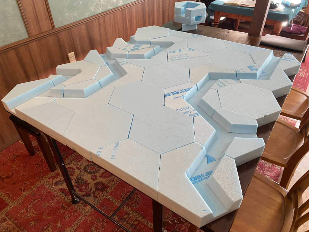The XPS cutting was easy thanks to a hot cutter table. I tried to be efficient, but I'm still left with two full Ikea bags of XPS offcuts, it will be useful for scatter terrain and other fancy trench+crusady stuff. The important thing was to prepare jigs for the hexagons and half-hexagons, and jigs for the "negative trenches". I also had a jig to set the trench angle on the hot cutter table.