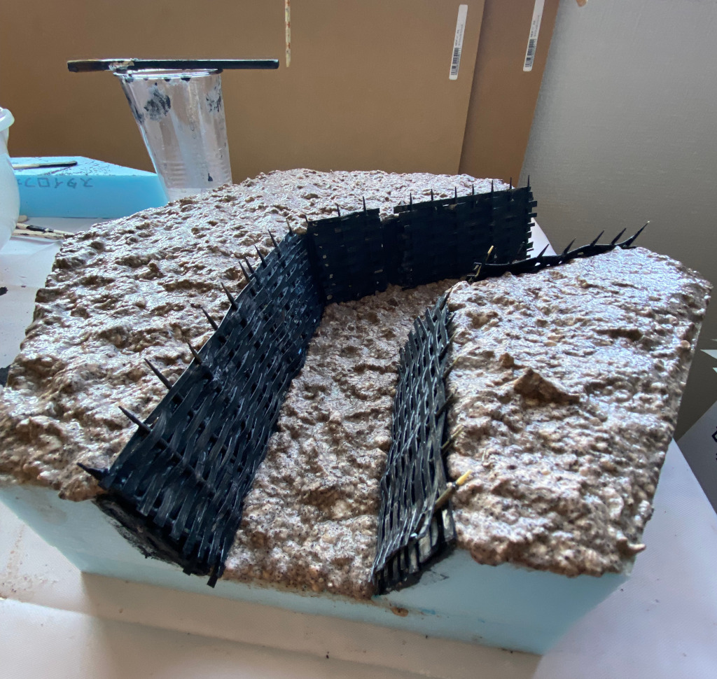 For the sides of the trenches, I collected Amazon paper envelope, since their inner side look like corrugated metal sheet, yes, that'll require some paiting. I also tried wattle weaving, at first with slices of light cardboard slaloming toothpicks, then I replaced the cardboard with the bristles of one dollar broom.