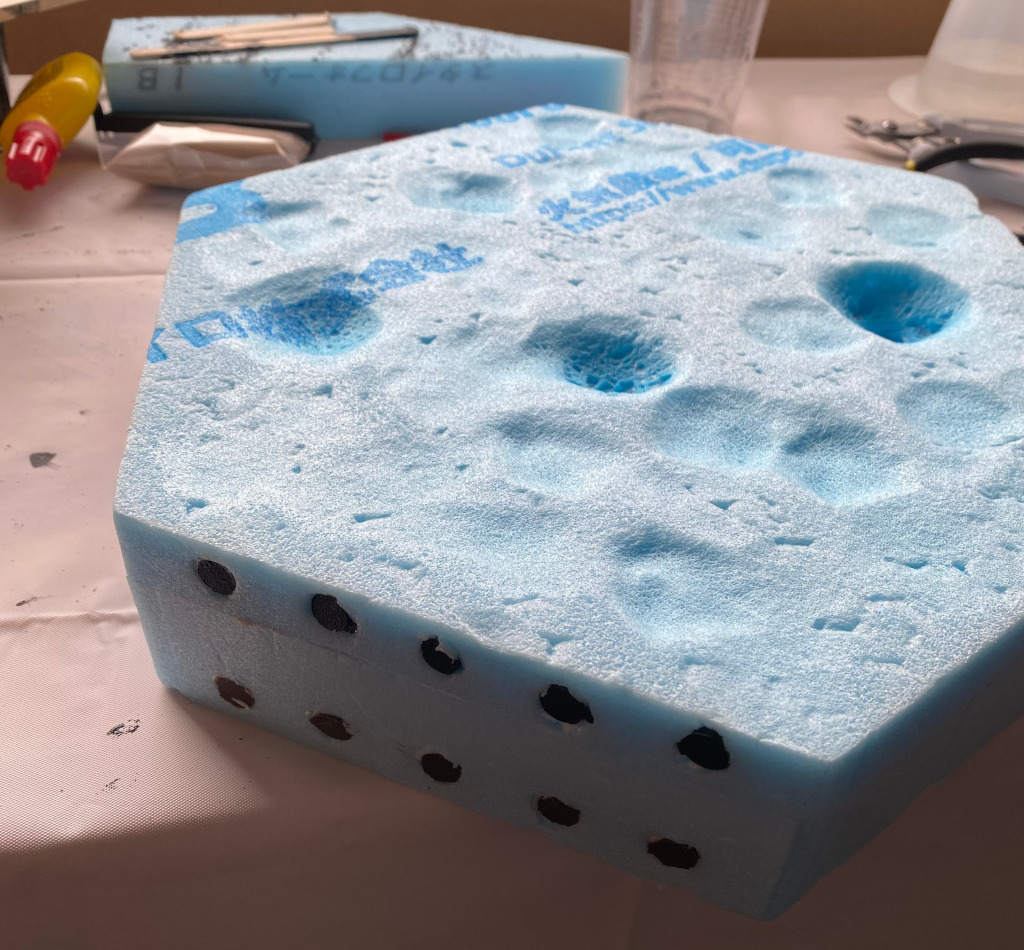 Trench hexagons contain a section of trench and are single sided, while plain hexagons are double-sided. A flat side and a depressed / craterized side. I experimented with craters made bit hammer hits, by brush cleaner liquid corrosion, heat gun attack, and lastly, with the impact of a 24 kg russian kettlebell 1 meter fall.