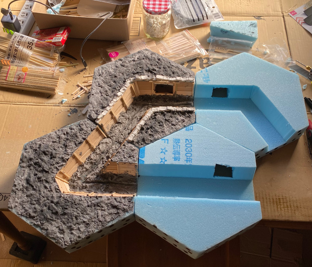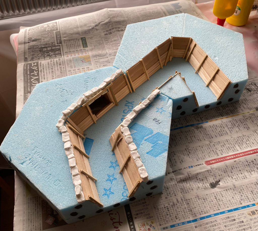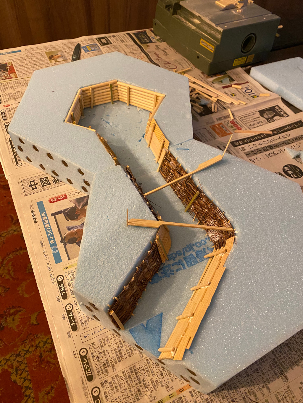 My thinking is, when trenches are first dug, there might be enough small wood for wattle fences, then local supply ends end planks are made available, later on corrugated sheets are supplied. Each hex has different pattern. I also experimented by logs and more vertical walls. The logs are round chopsticks while the vertical poles are skewers.