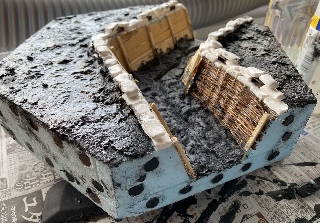 Now that I have rewatched the diorama video, I realize that the result of my efforts is plain. I like how the youtuber alternates vertical posts of different diameters, my toothipick game needs to be upped with the help of chicken skewers.