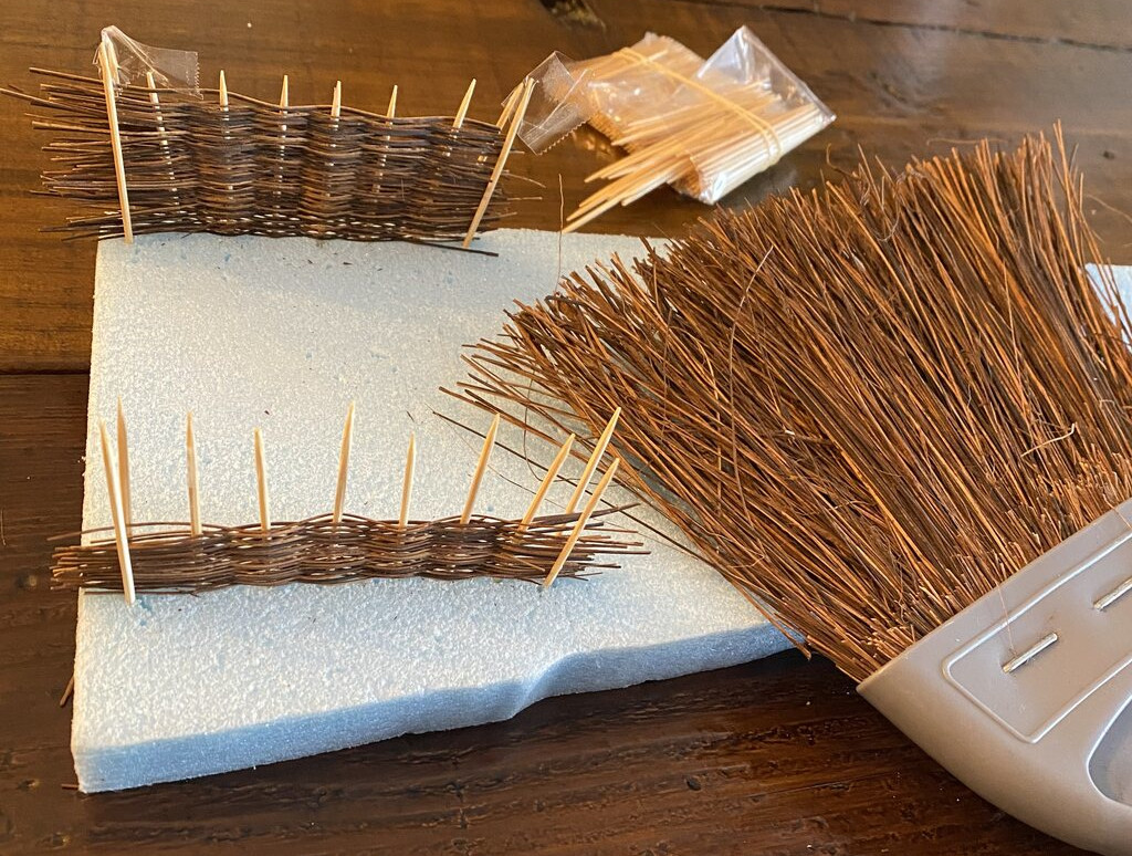 The horizontal thread should be thinner than the vertical posts. I was fortunate to come over a great video about a WW1 diorama, that was using broom bristles. I put on my coat and went to the dollar shop to get a broom and here I was, weaving bristles from one toothpick to the next.