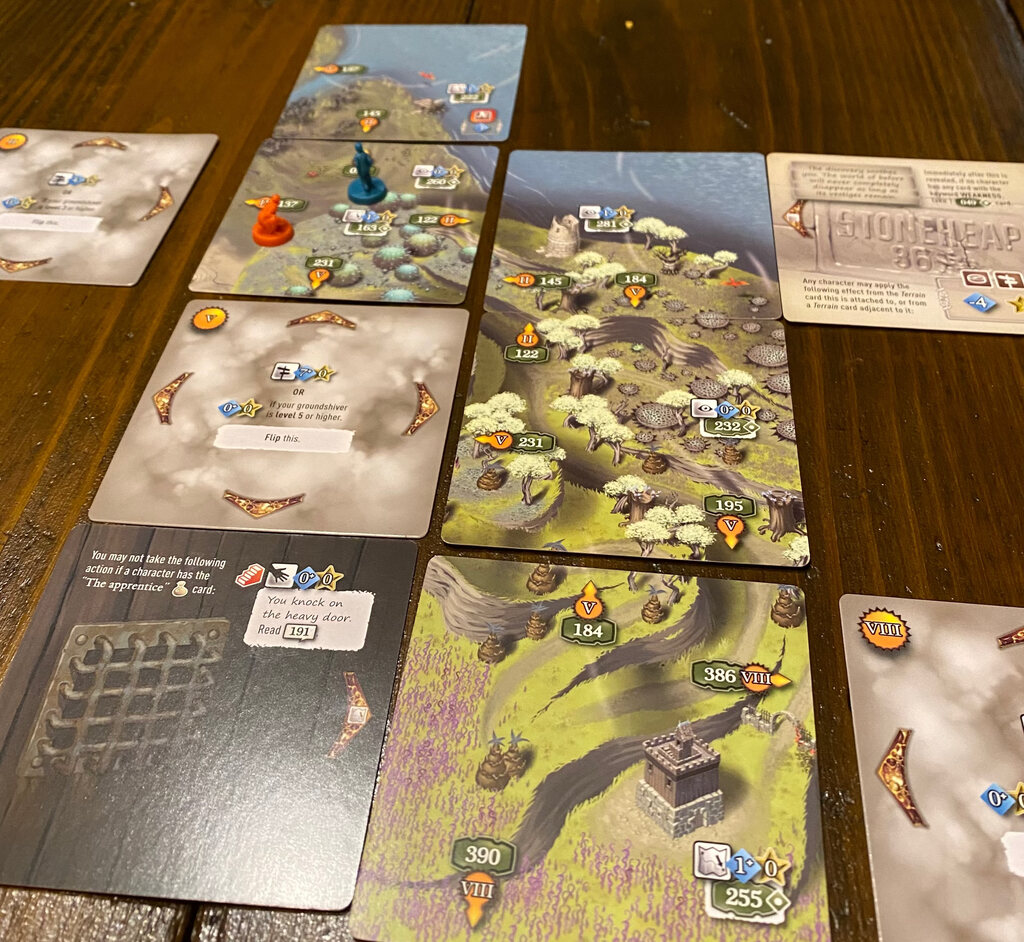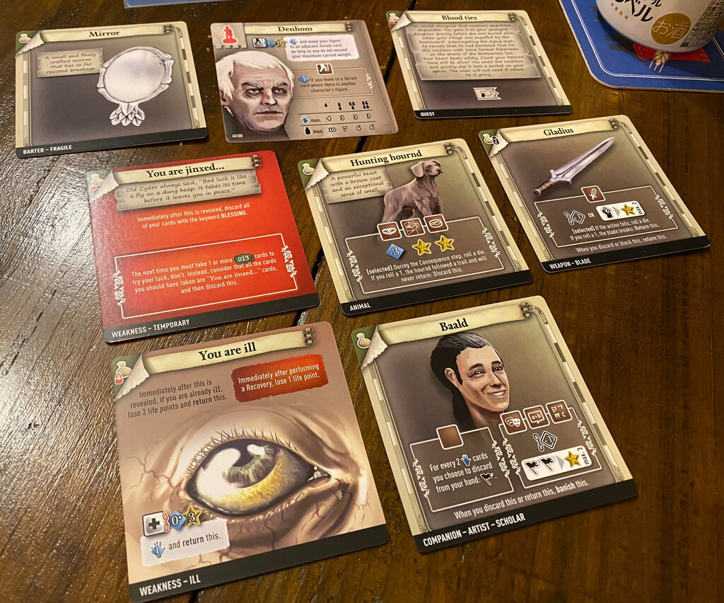 7th Citadel certainly inspired Vantage which we played a couple of times, a few heavy stack of cards await us, revealing blade by blade, sunlight beating fog, a world of greenery (beware) and lakes. Since we started the session late, we only managed to find an herbalist lady in her shack, a whiff of civilisation. I got myself a hound — a hournd — with a discerning nose but couldn't put it to good use yet (on a roll of 1 it'll abandon me).
