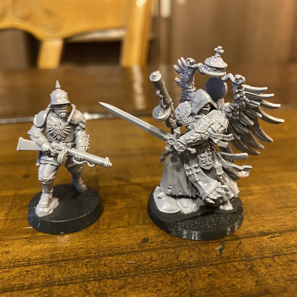 By their sides march the Feldkaplan, knightly chaplains clad in the finest warplate crafted by the Prussian Institute of Metallurgy, wrought as winged angels and wreathed in holy smoke. Their burning blades light the way for their fellow soldiers, and their booming prayers fill the hearts of all who hear them with righteous hate for the enemies of God
