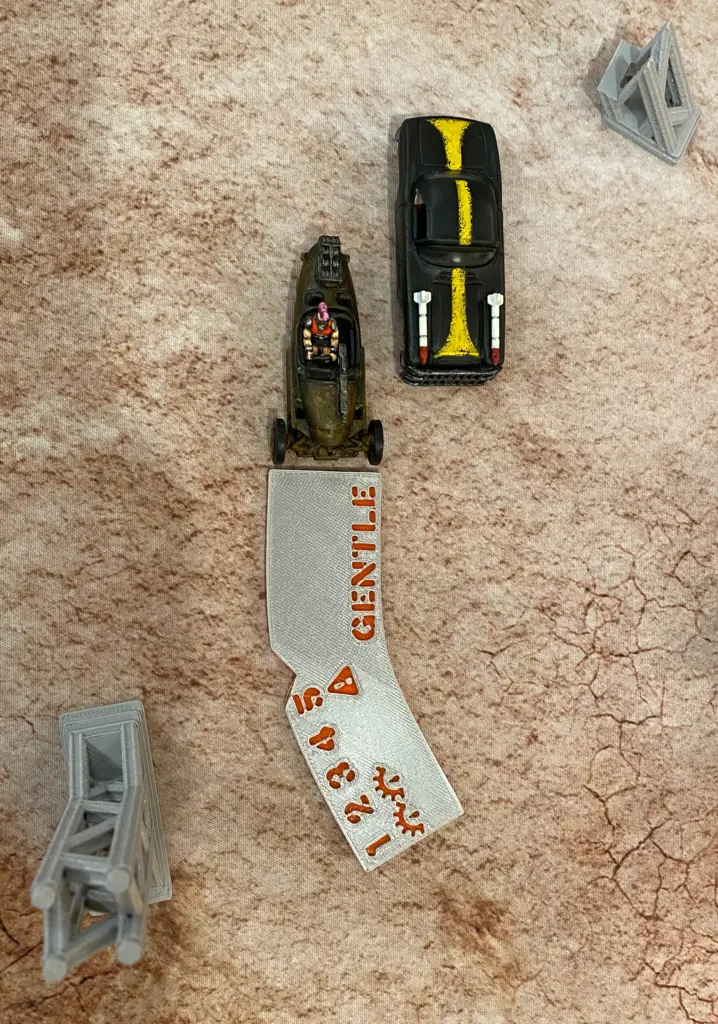 Kudos to my friend for kitbashing twice three cars, black and yellow cars vs punks with pink hair in green rusted sport utility vehicle adjacent mounts. We did two games, using the core of the game (no audience votes, no sponsors). After two gear phases I had the move/handling/shoot decision mechanisms locked in.