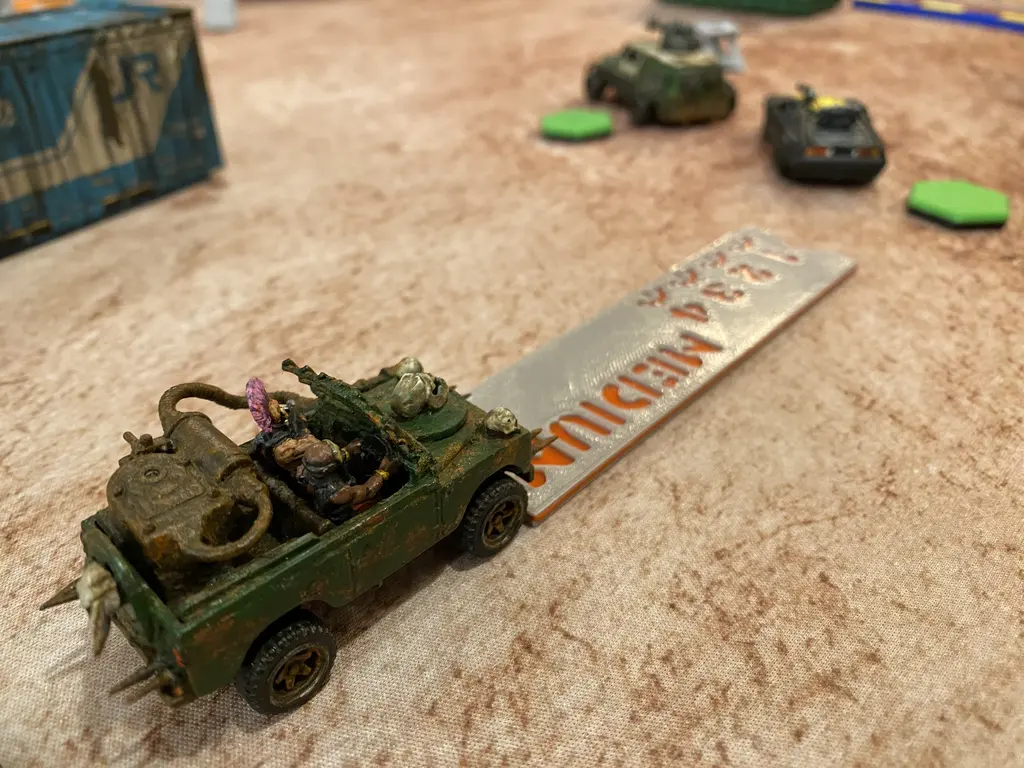 Our first game was a one vs one, and in our second game we aligned two cars each. I lost the two games, but much fun was had. I am looking forward to the next session. I am tempted to kitbash something on my side. I have a Hilux from Tomica, what will it become? I should rather focus on my trench warfare terrain.