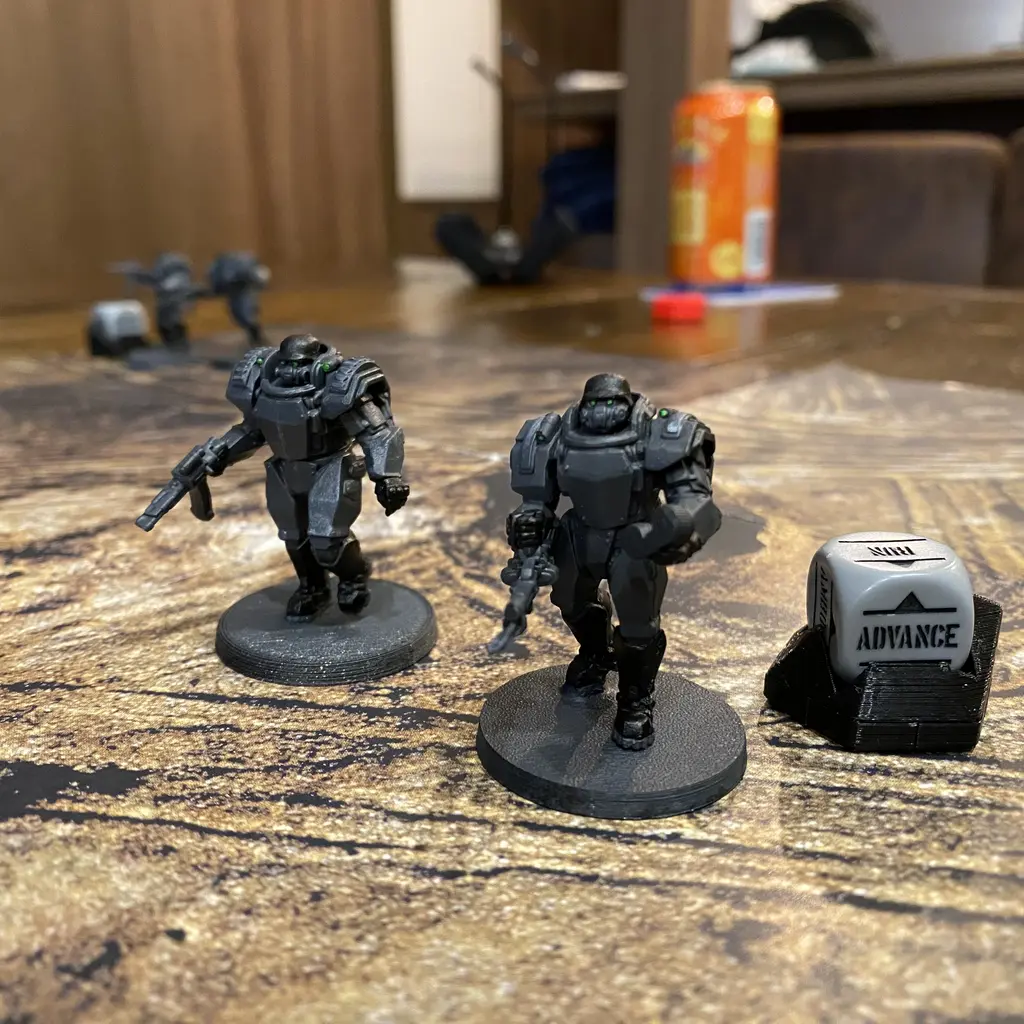 Konflikt'47 is a Warhammer 40K descendant, via Rick Priestley. You roll a handful or two of six-sided dice, fives and sixes hit, then the adversary's armor gets its say, roll high and it absorbs the hit. A Cover gives the target another merciful layer of dice roll. Range, line of sight, as usual.