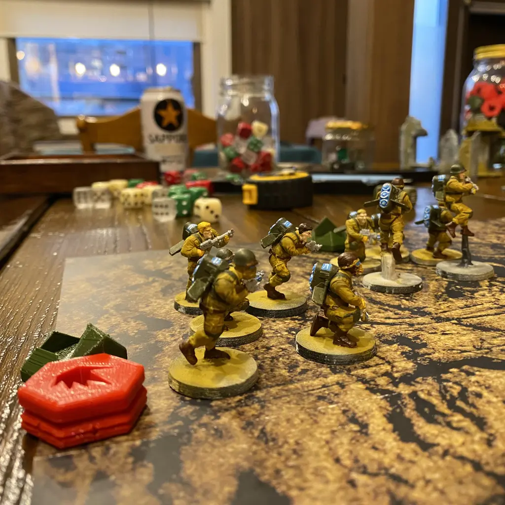 I love the order dice and the pin markers. I like the openness (the whole world of WW2 28mm miniatures is fair game), the Bolt Action rules and lists are usable if your opponent agrees (though a bit underpowered).